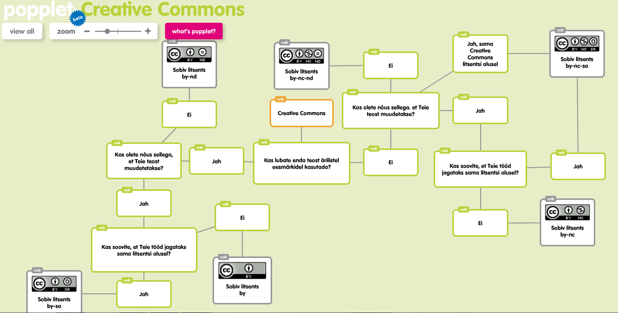 Meie kooli õpetajatel ja õpilastel tekib vahepeal küsimus sobiva Creative Commons litsentsi valimise kohta. Esimesed tahavad kaitsta oma õppematerjale, teised soovivad varustada litsentsiga oma blogi või esitlust. Antud probleemi lahendamiseks koostasid 10. klassi õpilased mõistekaardi, mis aitab Creative Commonsi litsentsi valida.